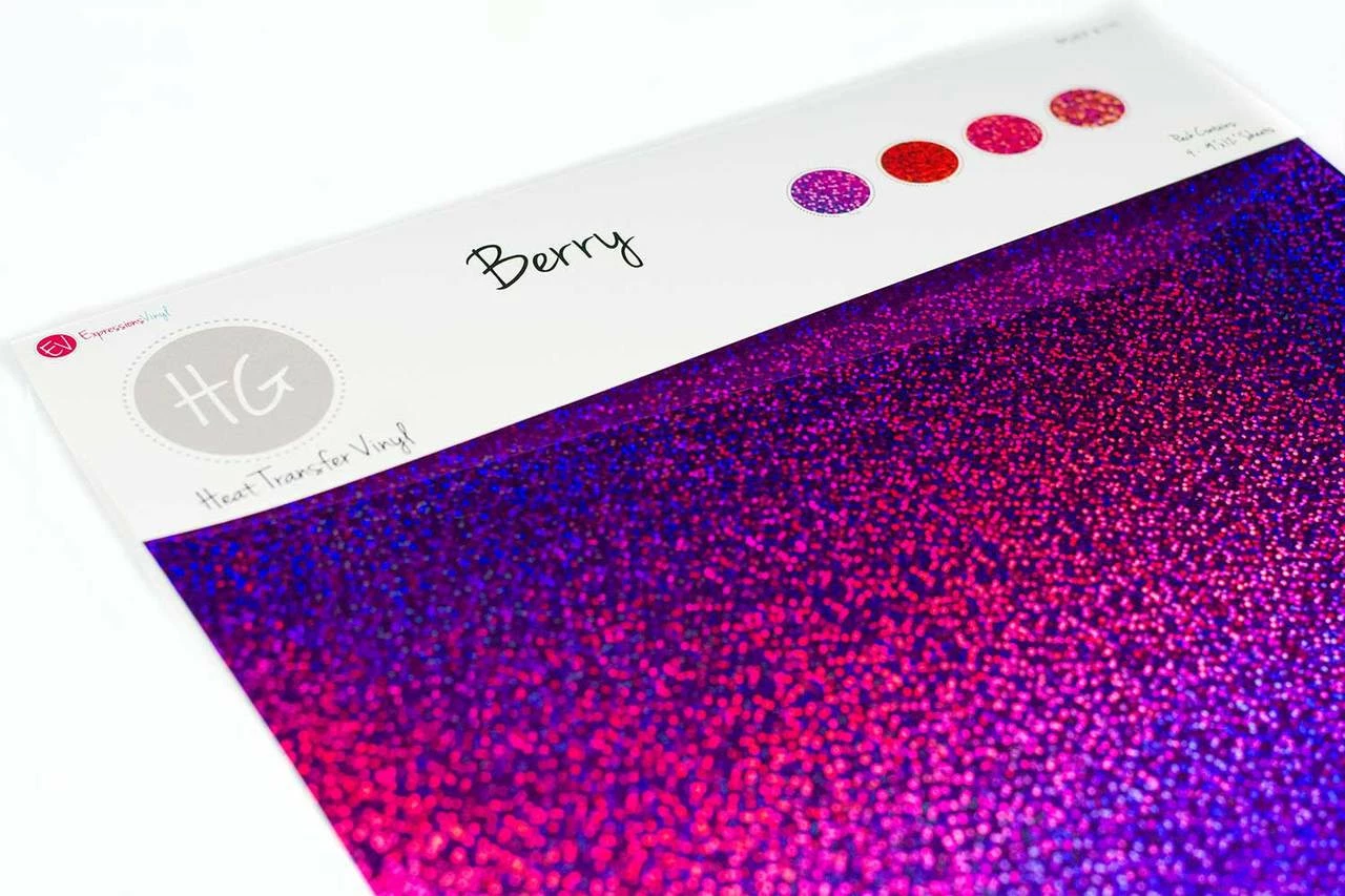 - Berry Pack Includes 9″x12″ Sheets of Siser Holographic HTV: Purple, Red, Fuchsia, and Light Pink