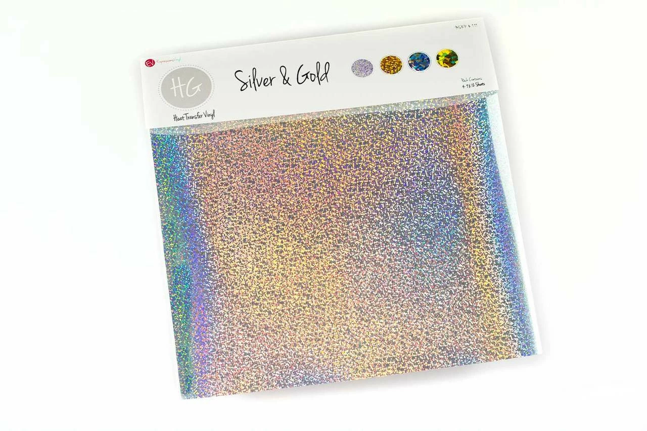 - Silver & Gold Pack Includes 9″x12″ Sheets of Siser Holographic HTV: Silver, Gold, Crystal and Gold Crystal